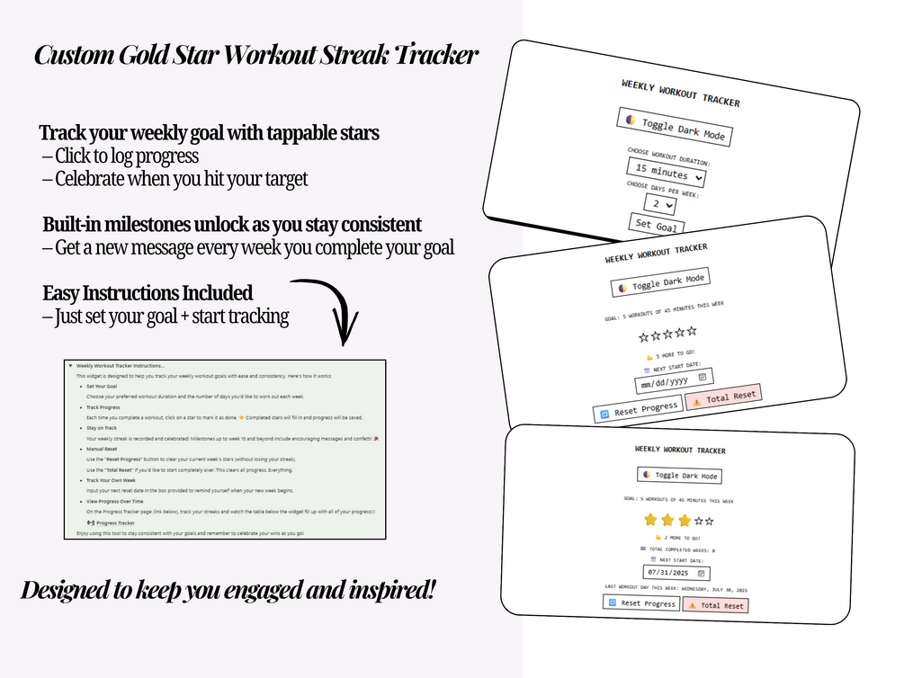 ✅ Custom Gold Star Weekly Workout Streak Tracker (with confetti + streak milestones!)